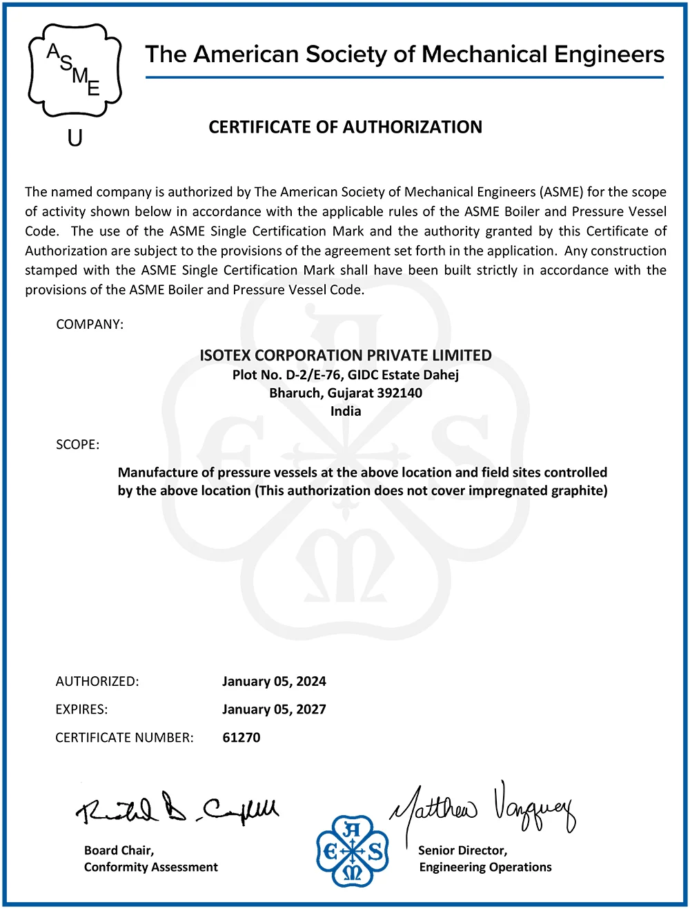 Isotex Global is officially certified by the American Society of Mechanical....