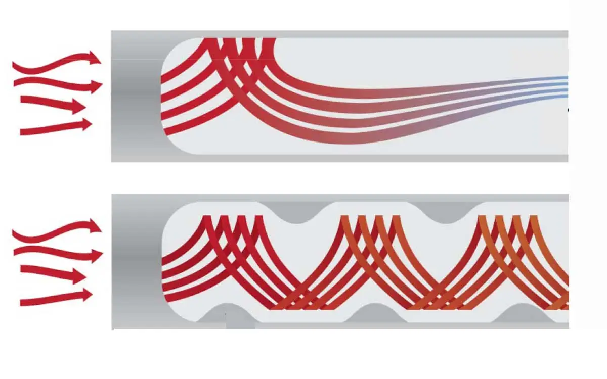 In a traditional bare tube used in the majority of boiler designs, the hot combustion gases enter the tubes in a turbulent flow pattern. This initial turbulent pattern produces good heat transfer initially, but the hot flue gas pattern quickly changes to a laminar flow, or a straight parallel flow of gases. With the gases traveling in this straight pattern, a boundary layer forms along the tube walls, increasing with the distance of the tube. This layer serves as a barrier, retarding heat transfer. As a result, a bare tube only utilizes a fraction of its diameter for heat transfer, which equates to a lot of wasted space.